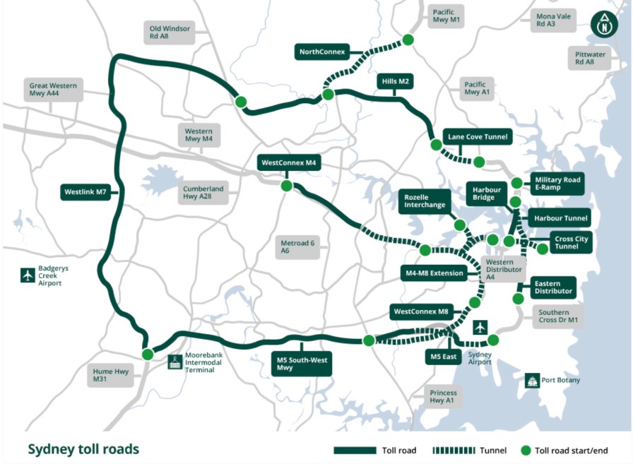 以下、シドニーの有料道路になります。地図の右側のイースタンサバーブと呼ばれる空港のある地域、またシドニーの北と南を繋ぐあたりの、便利な場所に集中しています。