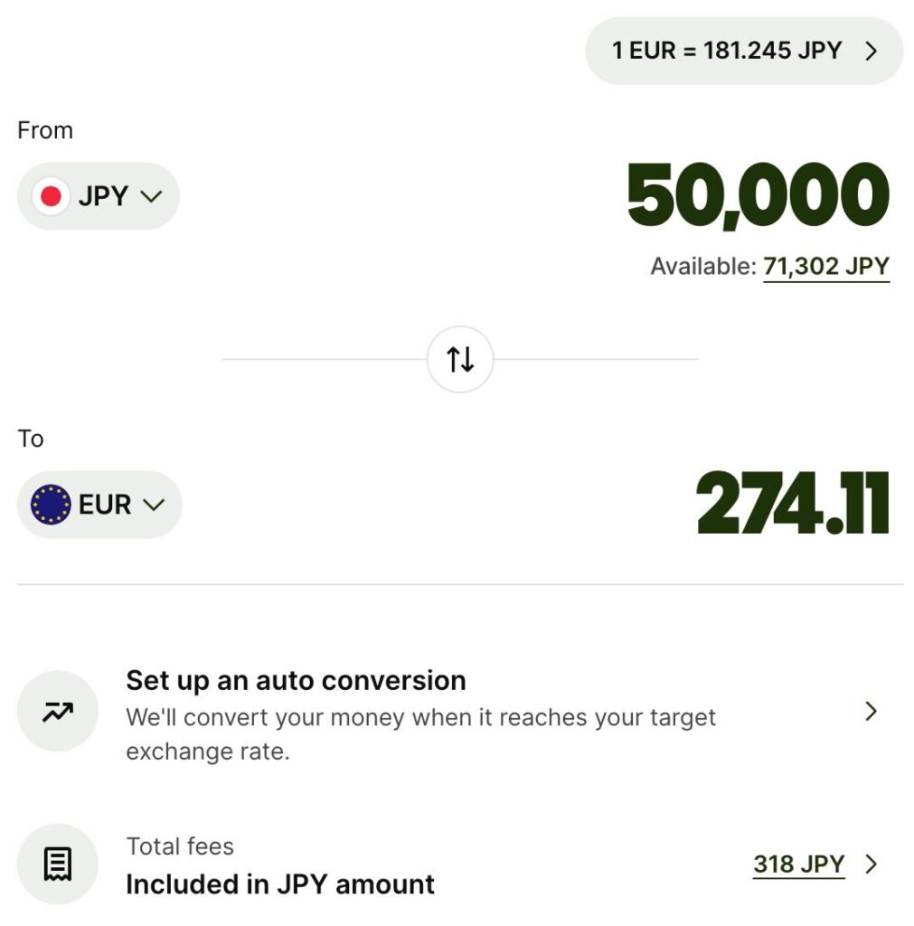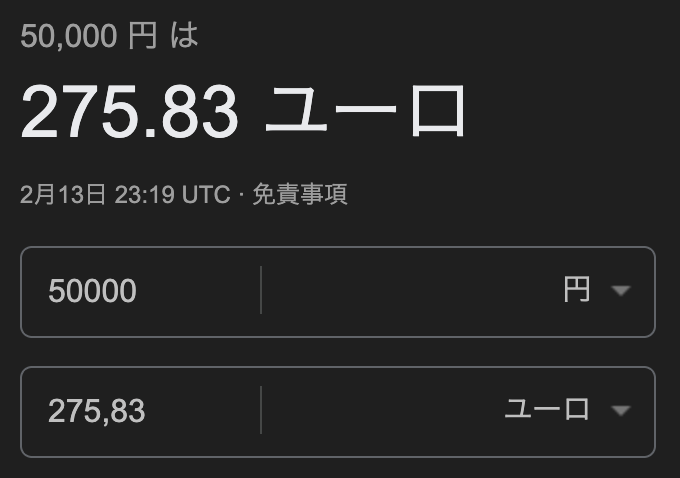 | 換算後 | 274.11ユーロ (⭐️受け取り手数料込み) | 275.83ユーロ (手数料含まない) |